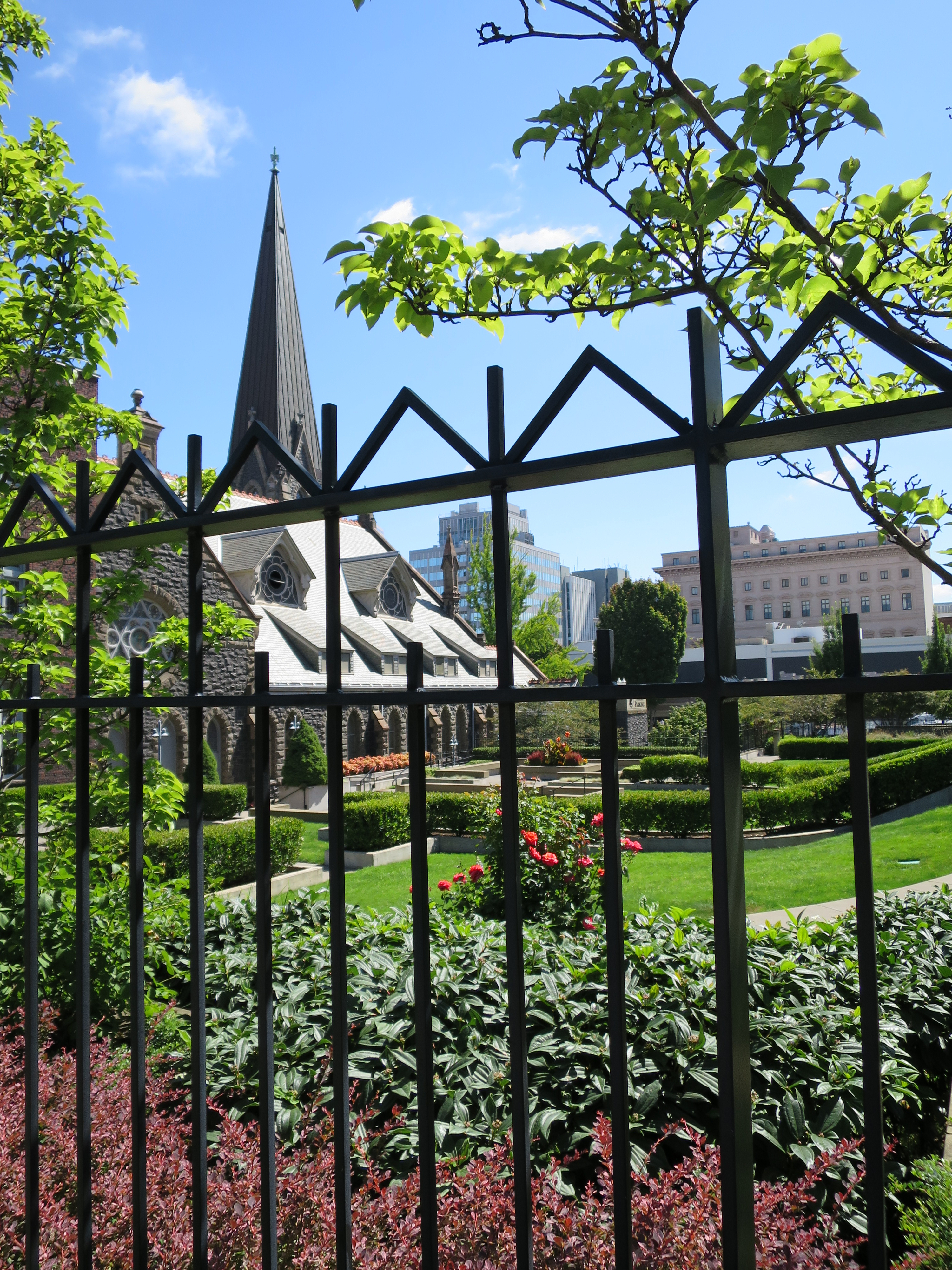 which is across the street from Pioneer Courthouse Square. Apparently the grand hotel that was there was torn down in the ’50s to be replaced by a parking lot. In the ’70s, the block was reclaimed as a public space. The gate is apparently from the original hotel.